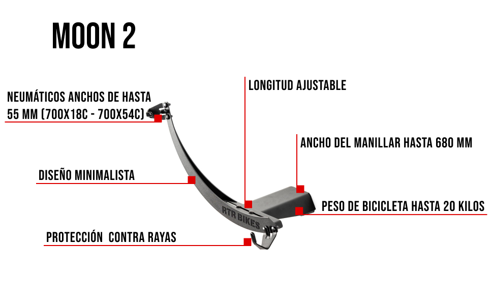 PROFESIONAL: El Soporte de pared MOON 2 de RTR BIKES es la elección perfecta para ciclistas exigentes, cuales aprecian la calidad alta y comodidad de uso. La ejecución precisa y diseño moderno no fallará aún el cliente más exigente.