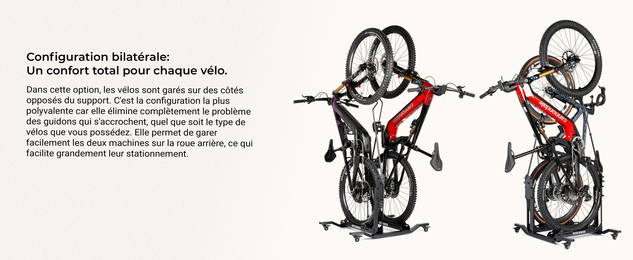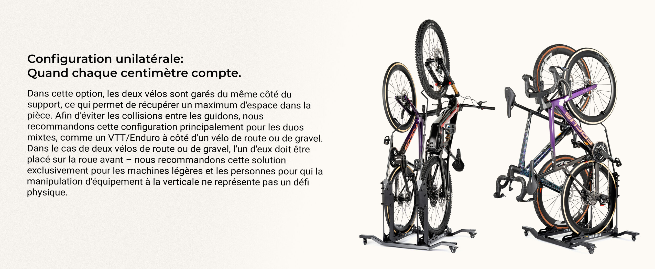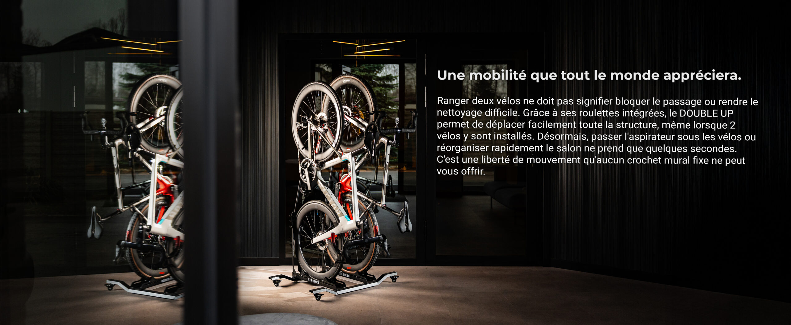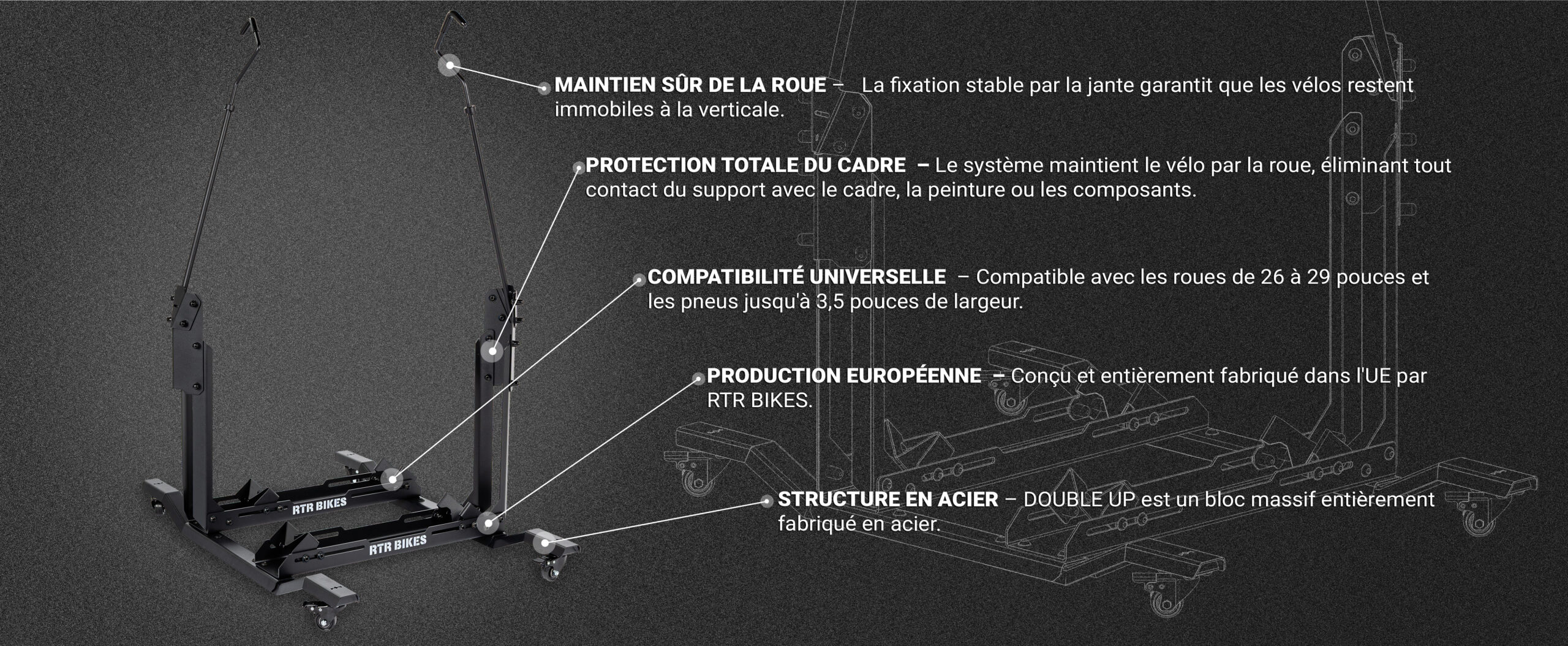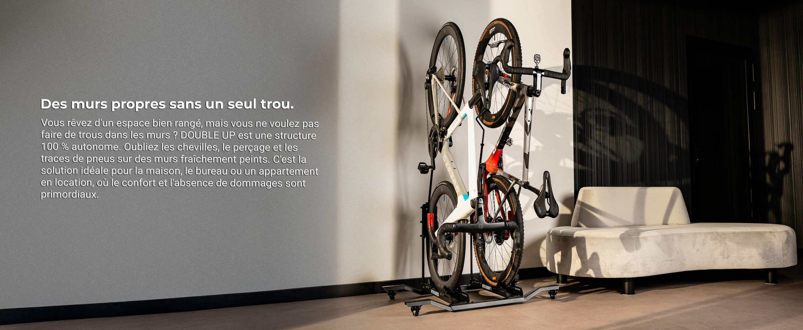 AUTONOME ET SANS PERÇAGE: Oubliez les supports muraux compliqués et les murs endommagés. Le système Double Up est totalement indépendant et tient debout tout seul. Il protège vos murs des traces de pneus disgracieuses et des rayures causées par le guidon.