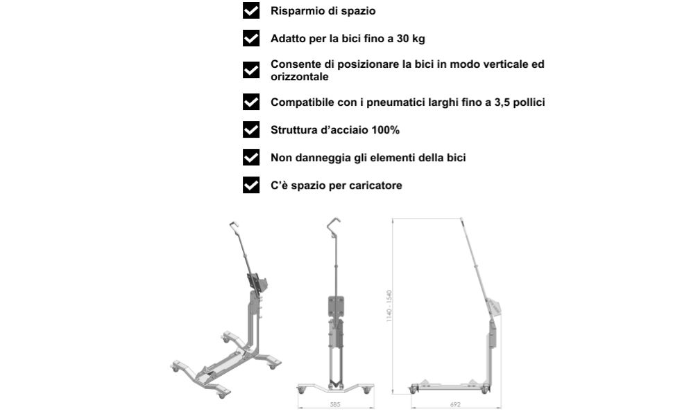 UNIVERSALE: Adatto per biciclette con pneumatici da 24 a 29 pollici di diametro e fino a 3,5 pollici di larghezza. Il cavalletto permette di riporre la bici sia in posizione orizzontale che verticale. Il supporto ha un posto per un caricabatterie per bici elettriche.