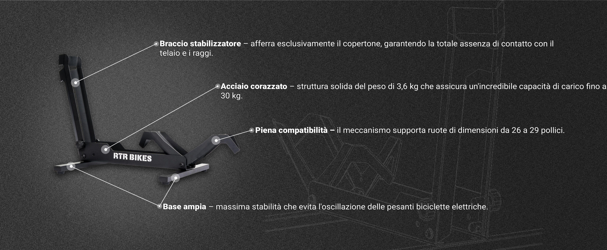 STABILE: La struttura del portabici e i materiali utilizzati garantiscono la stabilità elevata nel caso di biciclette fino a 30 kg, lo stoccaggio sicuro delle biciclette e la possibilità di lavare la bicicletta ad alta pressione senza rischio di caduta.