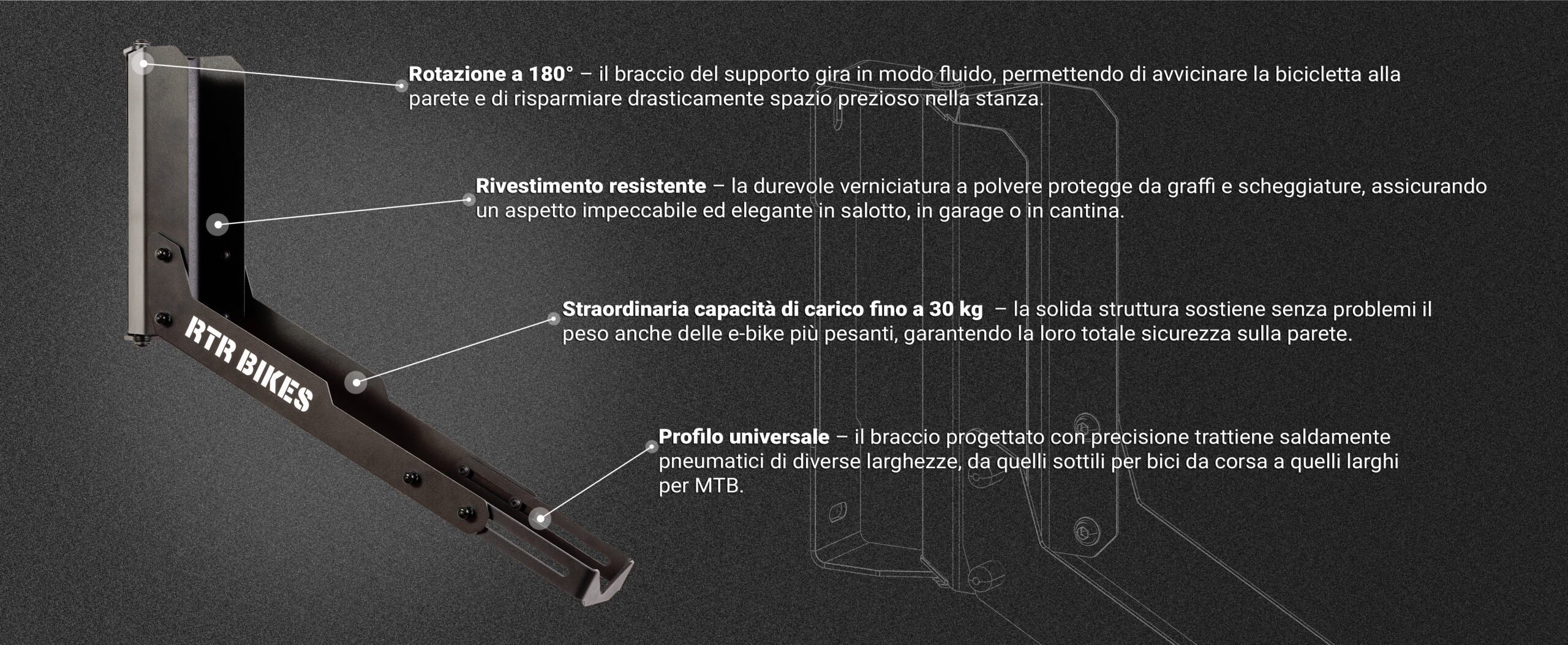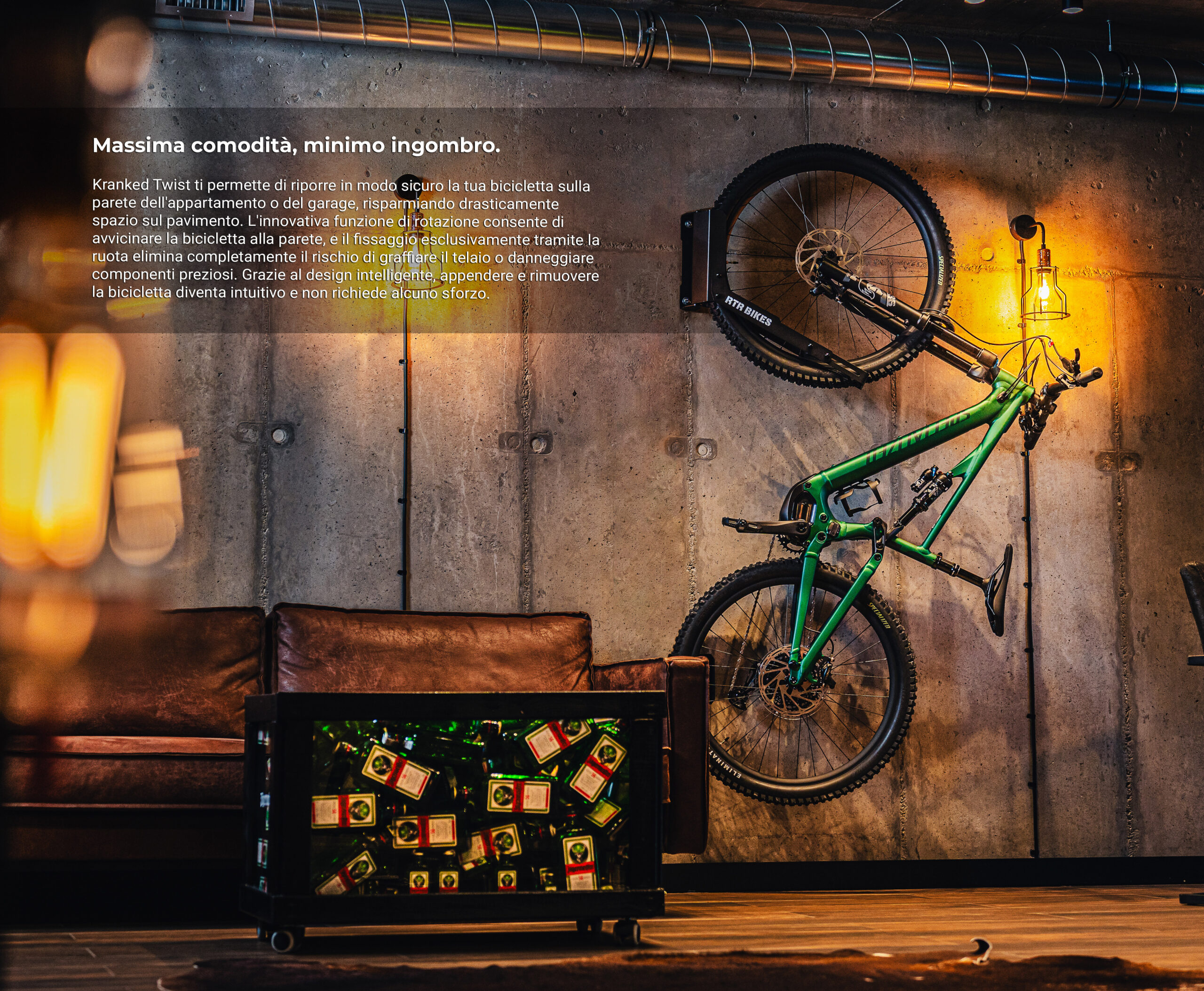 PROFESSIONALE: Appendi bici professionale rotante da muro KRANKED TWIST di RTR BIKES per apoggiare la bici dalla ruota anteriore è una scelta ideale per i ciclisti esigenti, i quali apprezzano l’alta qualità e la comodità d’uso. La lavorazione precisa e il design moderno non deluderanno nemmeno il cliente più esigente.