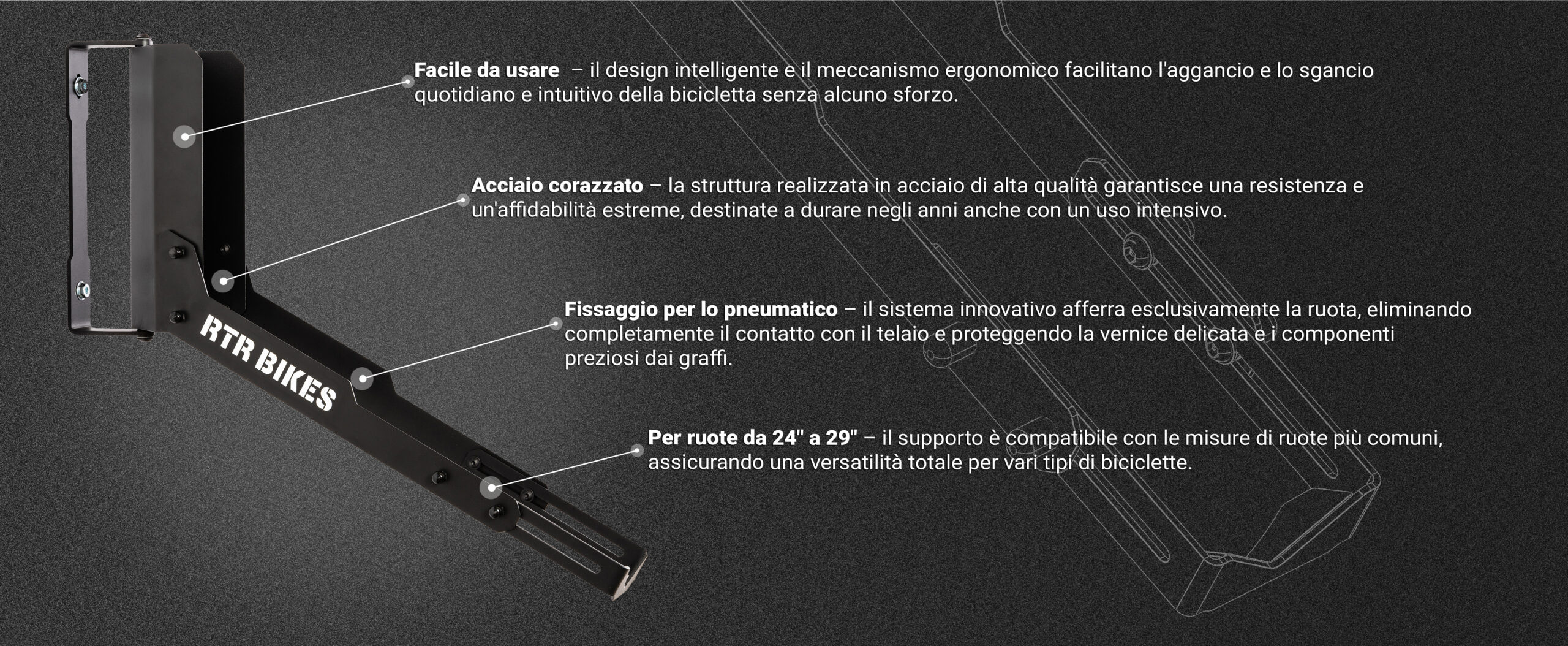 SENZA ALZARE: Per appoggiare la bici basta solo posizionarla sulla ruota posteriore e agganciare la ruota anteriore sul gancio profilato e regolabile.