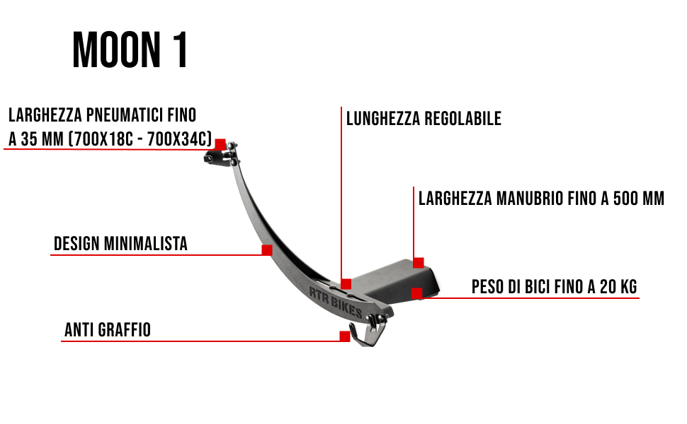 PROFESSIONALE: Appendi bici professionale da muro MOON 1 di RTR BIKES è la scelta ideale per i ciclisti esigenti, i quali apprezzano l’alta qualità e la comodità d’uso. La lavorazione precisa e il design moderno non deluderanno nemmeno il cliente più esigente.