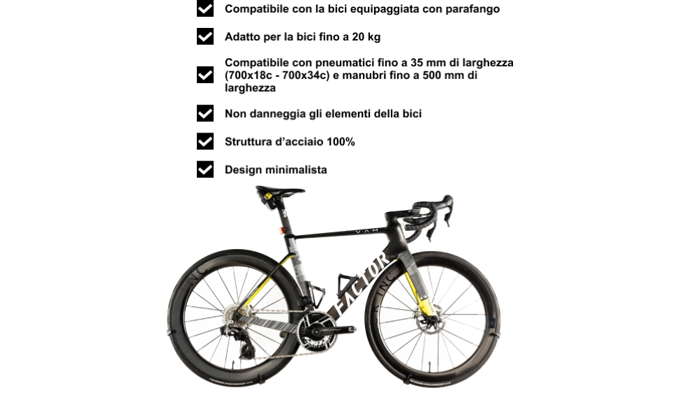 UNIVERSALE: Adatto a bici con pneumatici da 700x18c a 700x34c. Larghezza massima del manubrio: 500 mm. Facilmente puoi appendere una bicicletta che pesa fino a 20 kg.