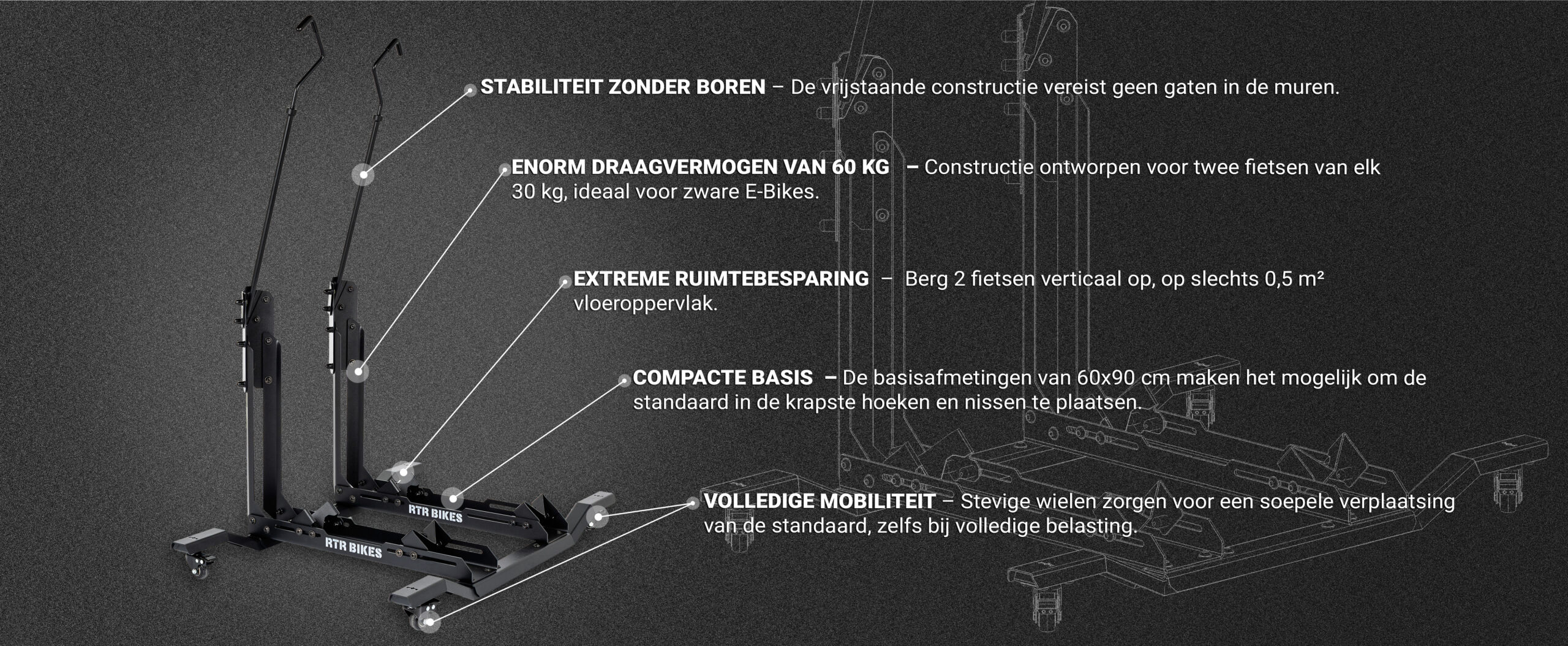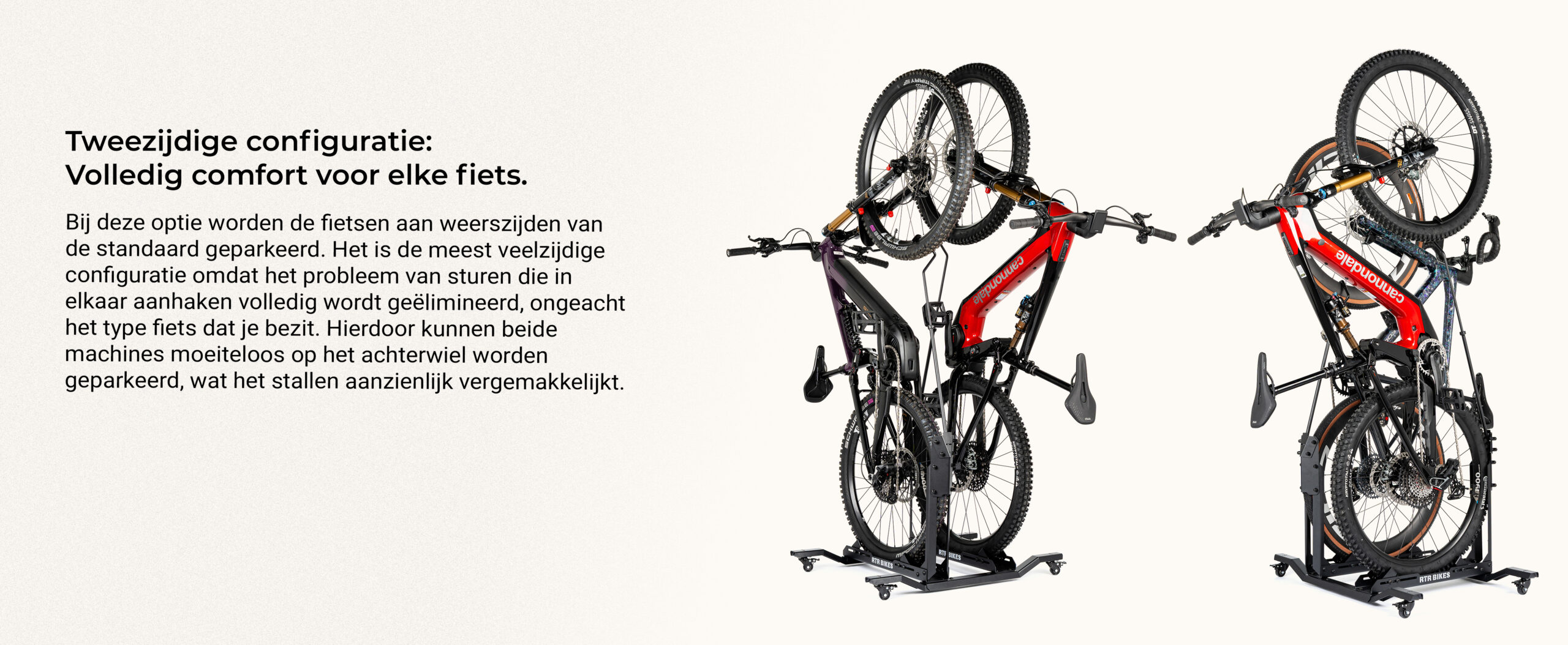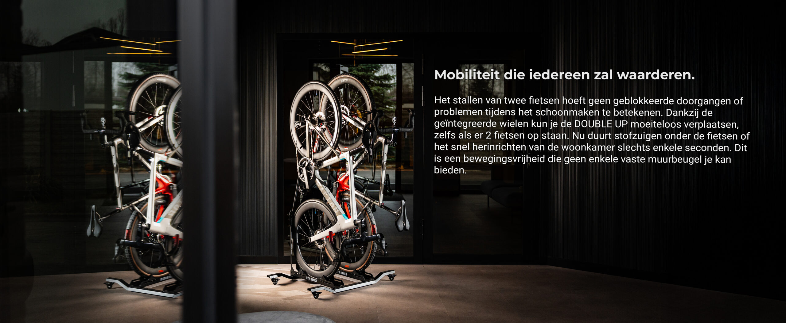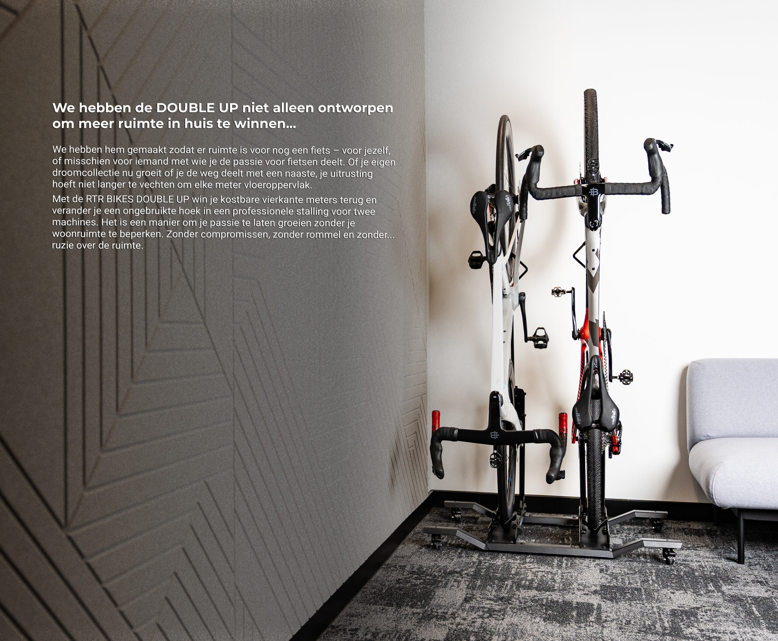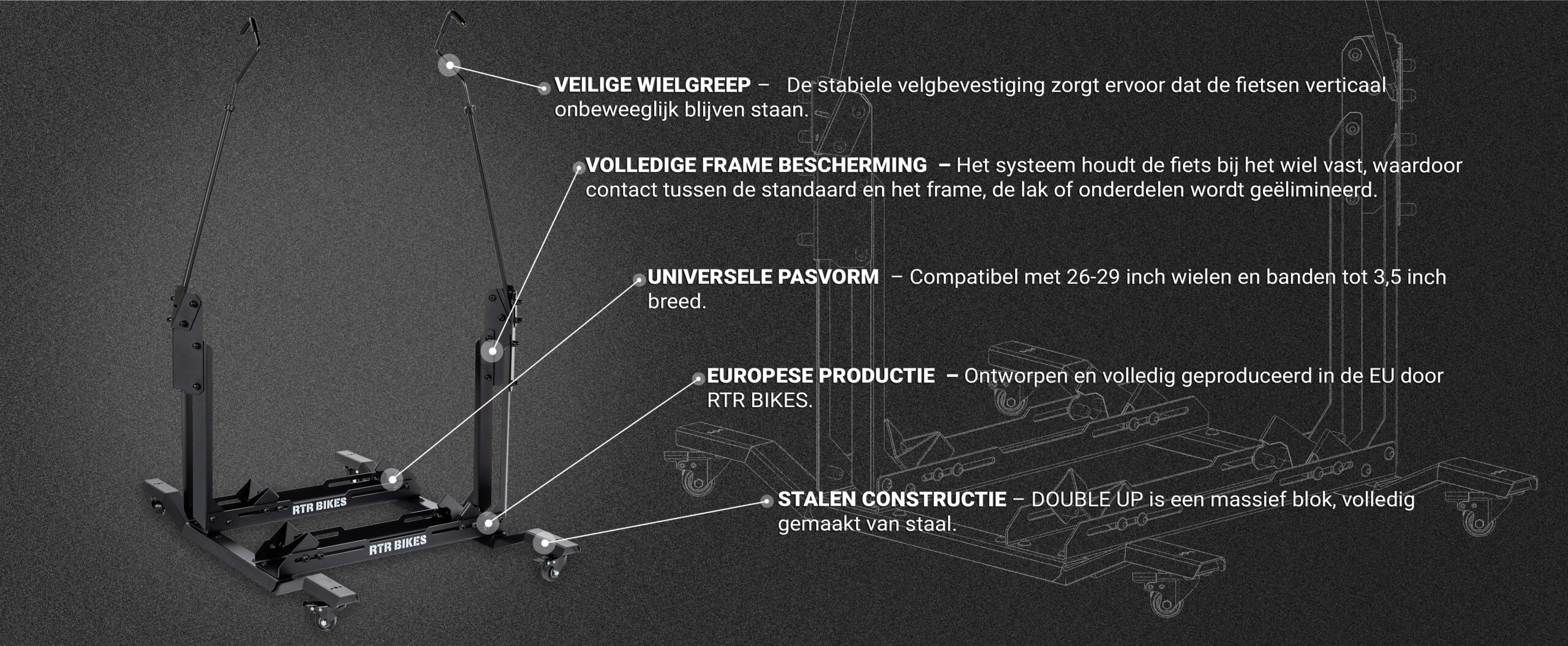 VRIJSTAAND & ZONDER BOREN: Vergeet ingewikkelde muurbeugels en beschadigde muren. Het Double Up systeem is volledig onafhankelijk en stabiel. Het beschermt je muren tegen lelijke bandensporen en krassen veroorzaakt door het stuur.