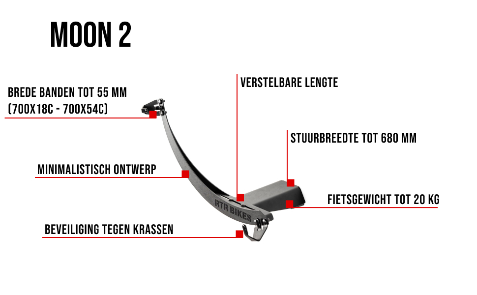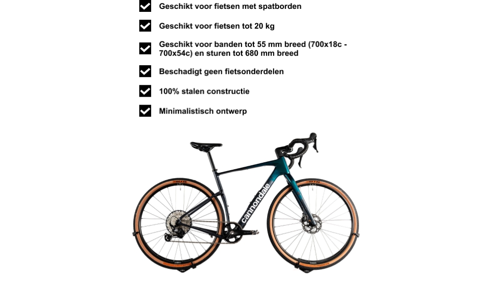 UNIVERSEEL: Compatible con bicicletas con neumáticos de 700x18c a 700x54c. Maximale breedte van het fietsstuur: 680 mm. Jij kunt er makkelijk een fiets van tot 20 kg ophangen.