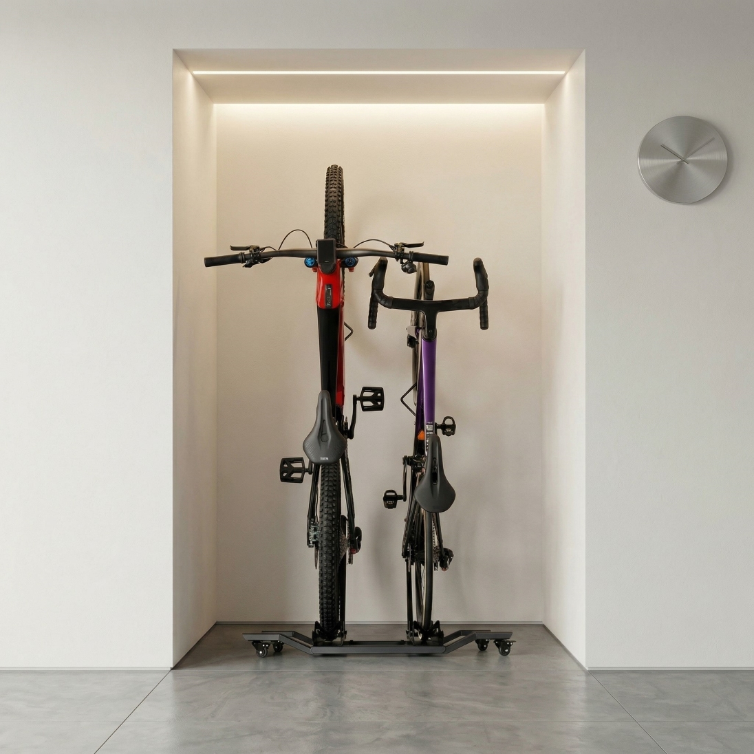 MAKSYMALNA OSZCZĘDNOŚĆ MIEJSCA: Przechowuj dwa rowery w pozycji pionowej na zaledwie ~0,5 m2. Kompaktowa podstawa stojaka o wymiarach 60×90 cm pozwala na zaparkowanie rowerów niezwykle blisko siebie. To idealne rozwiązanie do ciasnego garażu, piwnicy, biura lub mieszkania.