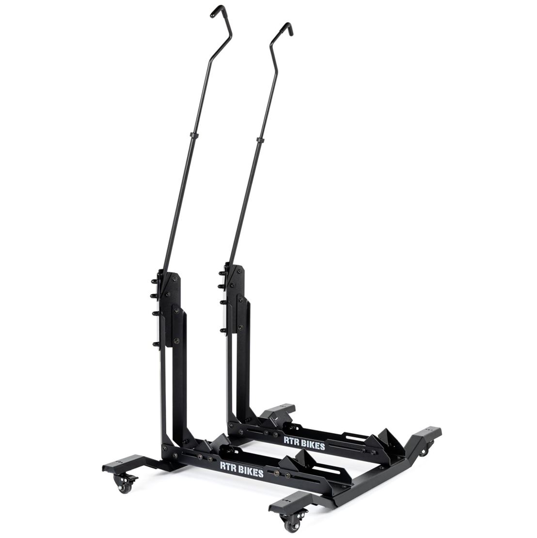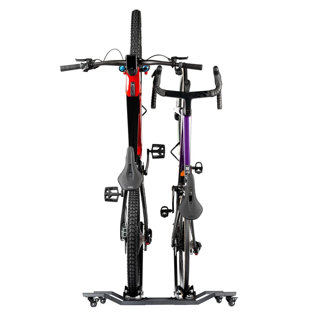 MOBILNOŚĆ BEZ WYSIŁKU: Stojak jest wyposażony w solidne kółka, dzięki czemu możesz go łatwo przesuwać w dowolnym kierunku. Posprzątaj podłogę lub przearanżuj przestrzeń bez konieczności zdejmowania sprzętu, nawet gdy na stojaku znajdują się dwa ciężkie rowery.