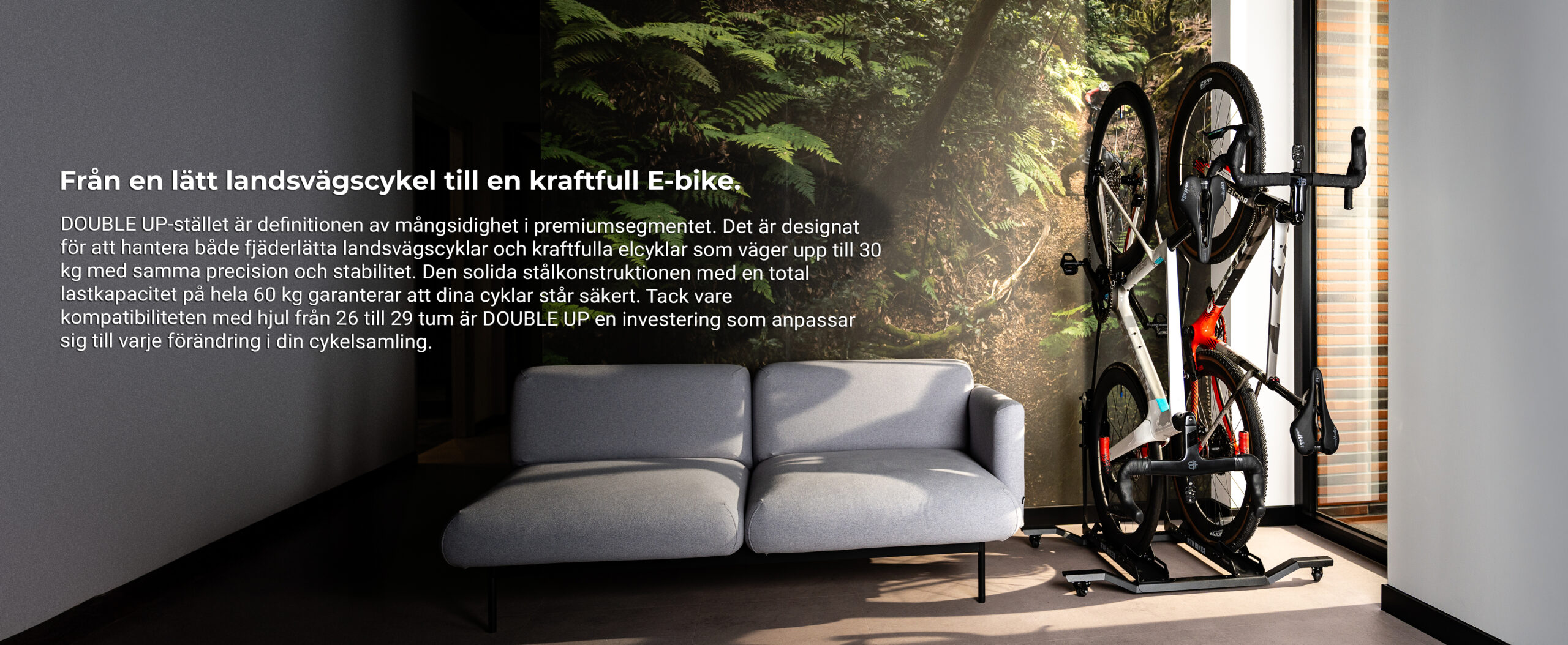 FRISTÅENDE OCH UTAN BORRNING: Glöm komplicerade väggfästen och skadade väggar. Double Up-systemet är helt fristående. Det skyddar dina väggar från fula däckmärken och repor från styret.