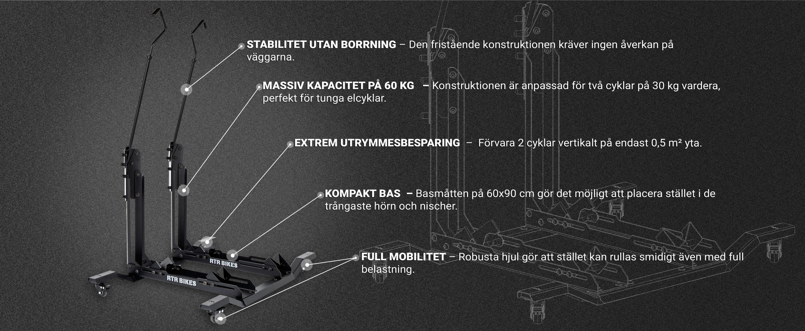 EXTREM KAPACITET UPP TILL 60 KG: Designad för moderna och tunga cyklar. Stället håller säkert två cyklar som väger upp till 30 kg vardera (totalt 60 kg). Perfekt anpassad för tunga elcyklar (E-Bike) och MTB.