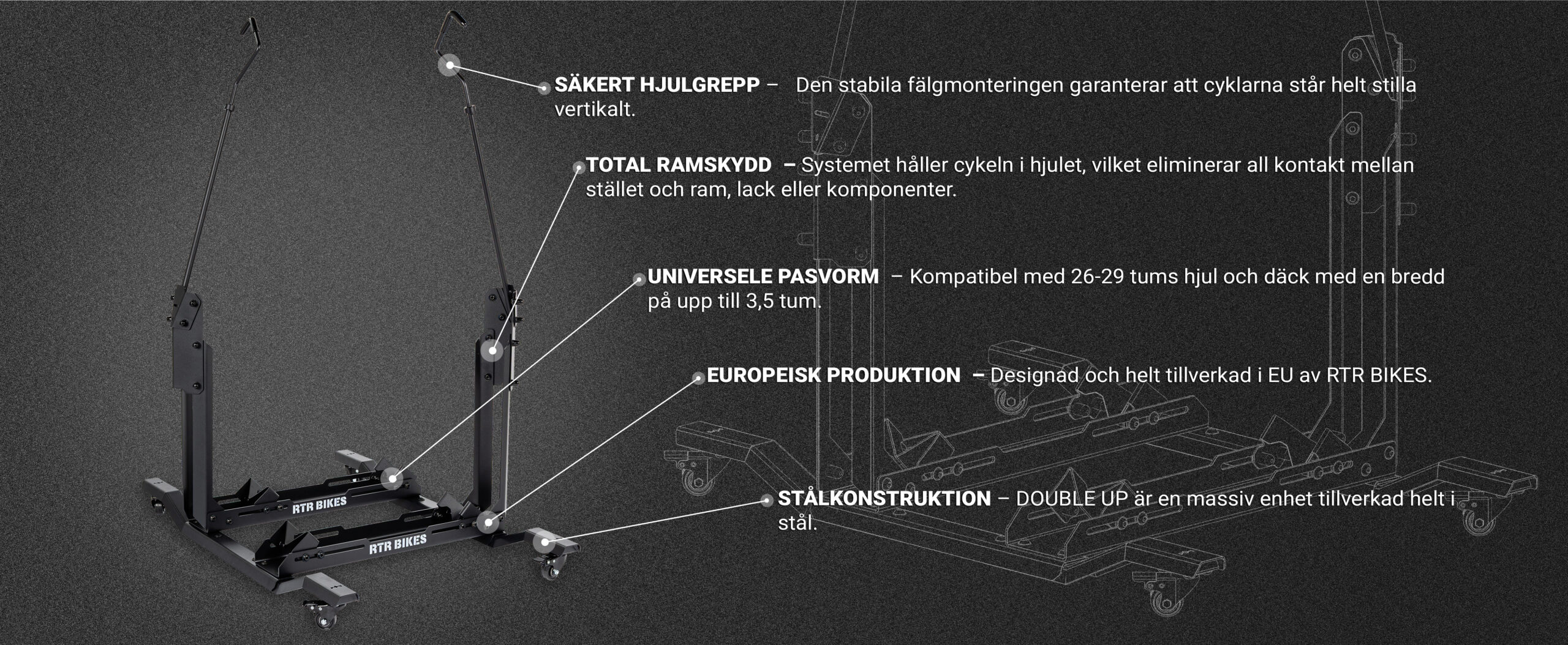 PREMIUMKVALITET MADE IN EU: Designad och tillverkad i EU av RTR BIKES. Det smarta hjulfästet håller cyklarna extremt stabilt via däcken och skyddar pålitligt känsliga kolfiberramar, ekrar och fälgar från repor.