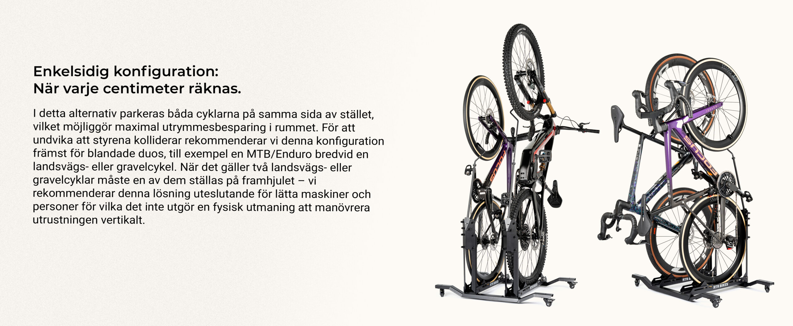 ENKEL MOBILITET PÅ HJUL: Utrustad med robusta hjul för tung belastning. Du kan enkelt flytta stället i alla riktningar, även när det är fullastat med två tunga cyklar. Städa golvet eller möblera om utan att lyfta.